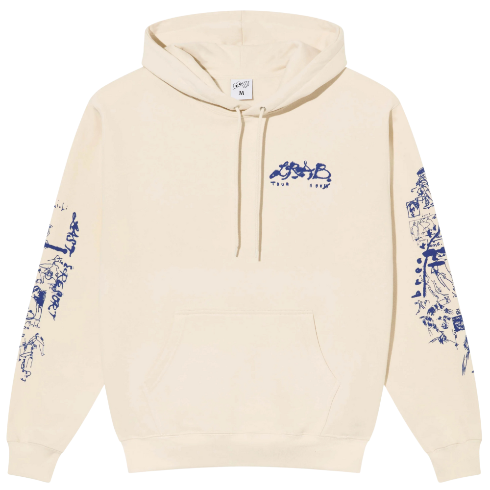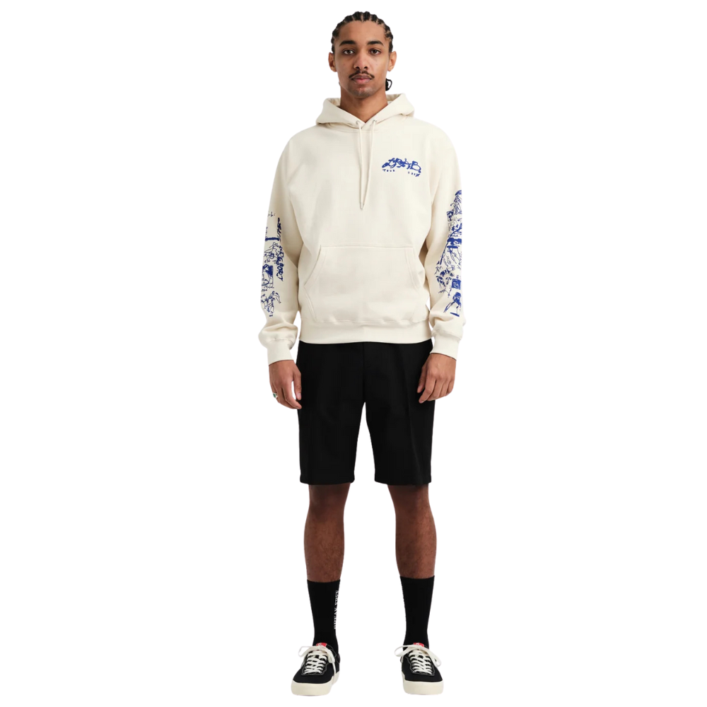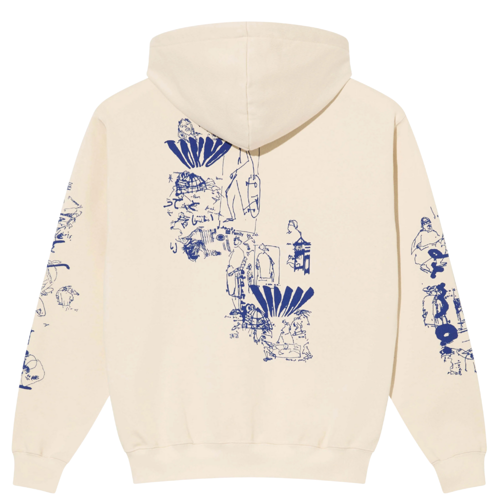Hooded sweatshirt in Natural White with blue artwork printed on the chest and sleeves. Kangaroo pocket at front.