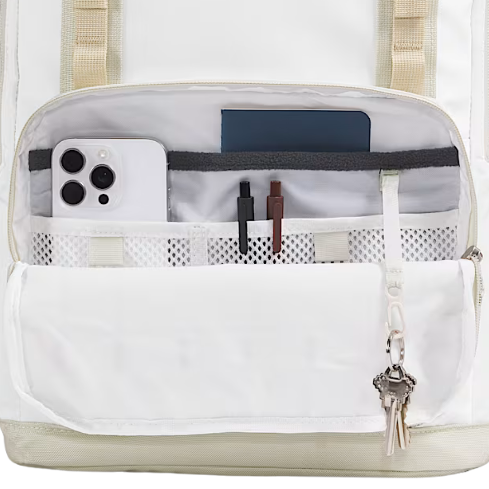 - External, secure-zip front pocket includes a fleece-lined sleeve, two mesh drop-in pockets and a key hook