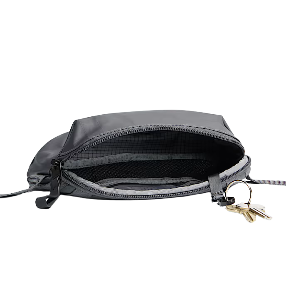 - Adjustable, stowable webbing strap allows for a waist or crossbody carry