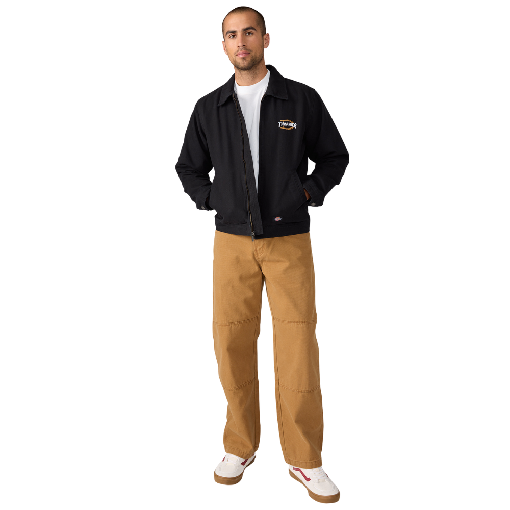 Η συλλογή Dickies × Thrasher γιορτάζει την κουλτούρα του skateboarding. Το μπουφάν είναι κατασκευασμένο από ανθεκτικό 100% βαμβακερό καμβά και διαθέτει πλάγιες τσέπες, ρυθμιζόμενες ταινίες στη μέση και στις μανσέτες, συν-υπογεγραμμένο κέντημα στο στήθος και εσωτερική επένδυση με στάμπα συρματοπλέγματος.